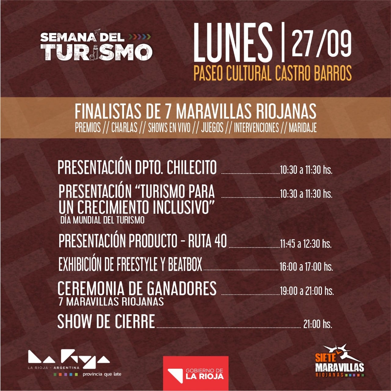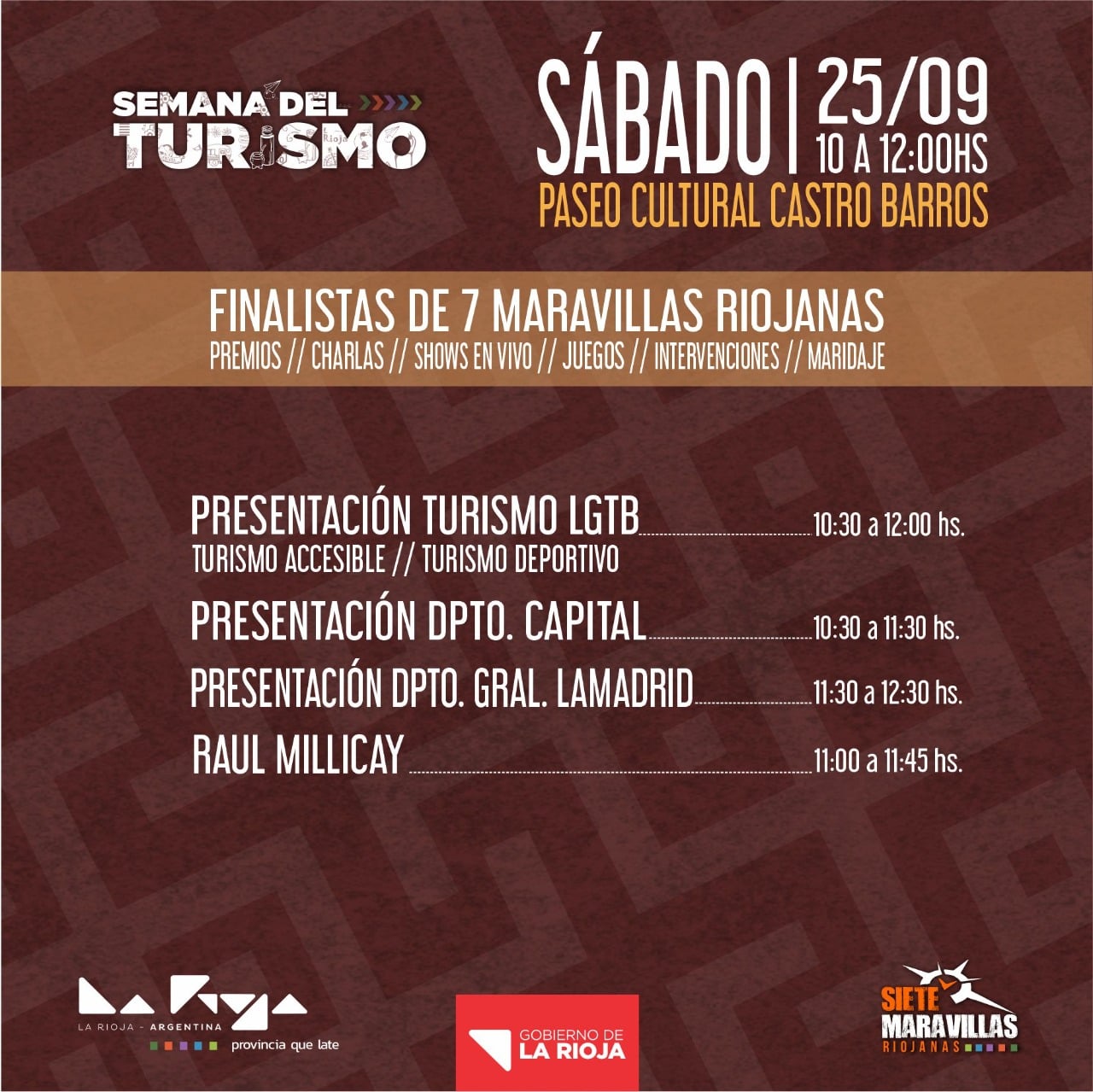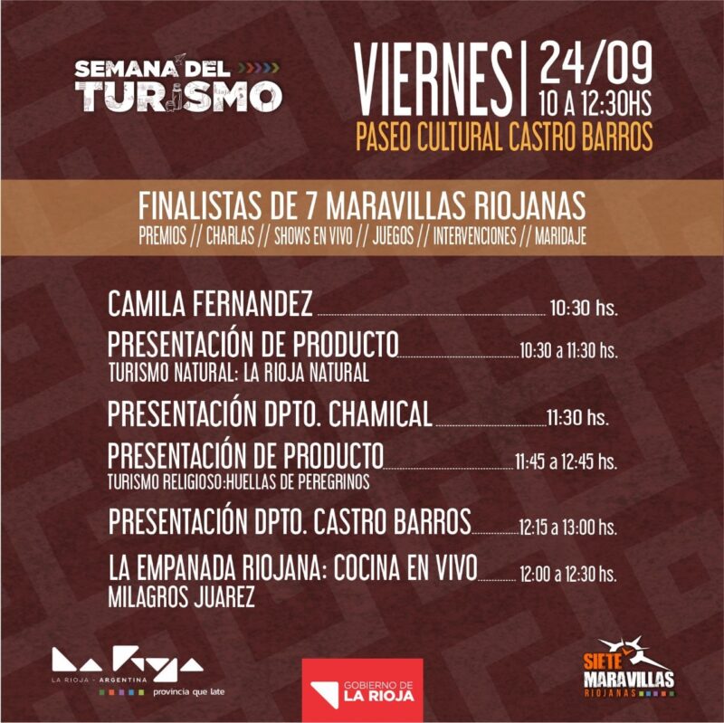 Del 23 al 27 de septiembre, se llevará a cabo en el Paseo Cultural Castro Barros, la Semana del Turismo con distintas actividades abiertas a la comunidad. El lunes 27, coincidente con el Día Internacional del Turismo, será la gran final del concurso #7MaravillasRiojanas donde conoceremos los siete destinos ganadores.