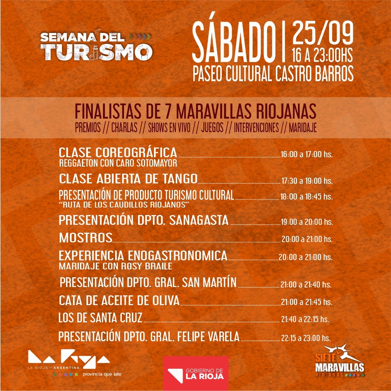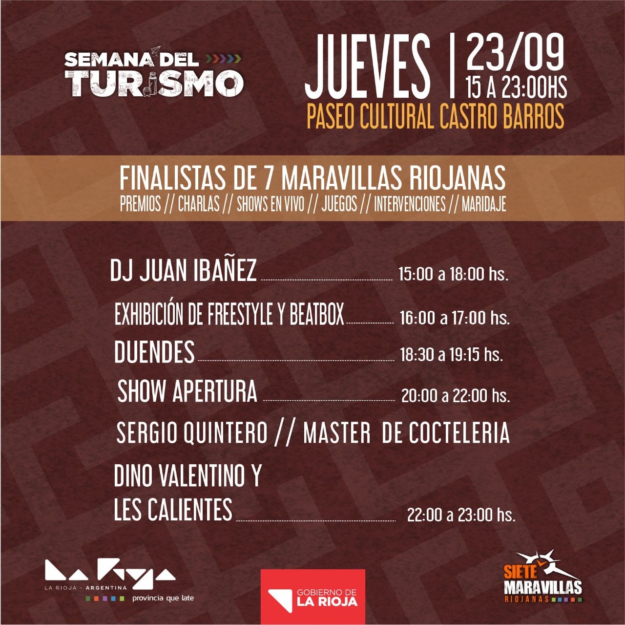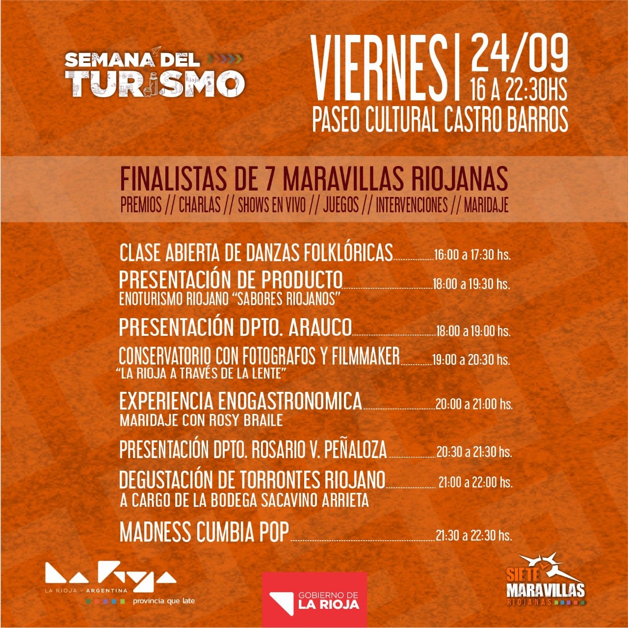 Del 23 al 27 de septiembre, se llevará a cabo en el Paseo Cultural Castro Barros, la Semana del Turismo con distintas actividades abiertas a la comunidad. El lunes 27, coincidente con el Día Internacional del Turismo, será la gran final del concurso #7MaravillasRiojanas donde conoceremos los siete destinos ganadores.